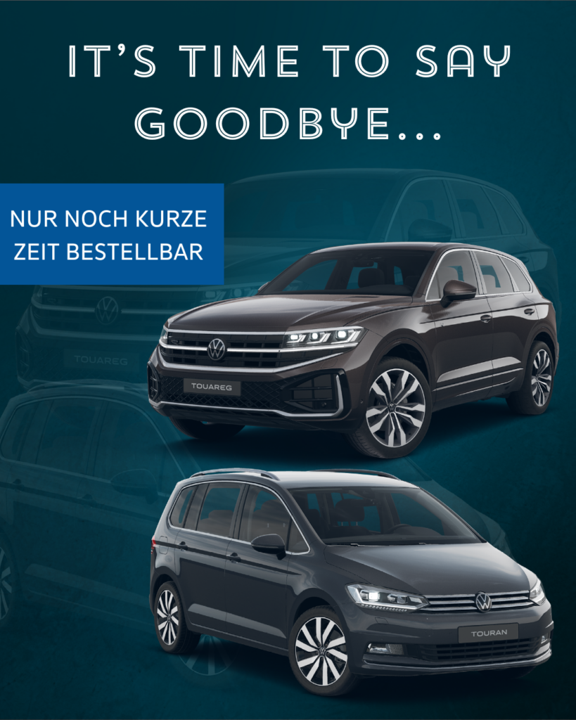 Die Modelle Volkswagen Touareg und Volkswagen Touran gehen in die finale Bestellphase. Beide Fahrzeuge laufen aus und sind nur noch für kurze Zeit bestellbar.