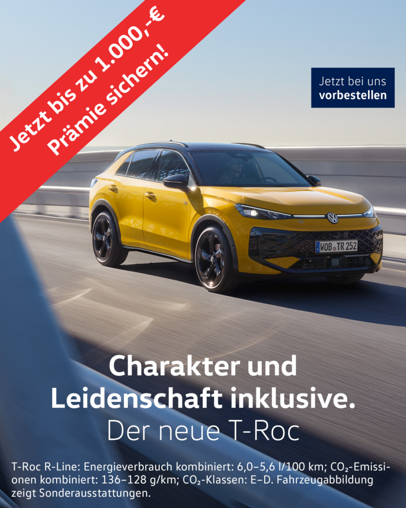 Ein Angebot der Volkswagen Leasing GmbH, Gifhorner Straße 57, 38112 Braunschweig, für die wir als ungebundener Vermittler gemeinsam mit dem Kunden die für den Abschluss des Leasingvertrags nötigen Vertragsunterlagen zusammenstellen. Bonität vorausgesetzt. Für Verbraucher besteht ein gesetzliches Widerrufsrecht. Etwaige Rabatte bzw. Prämien sind im Angebot bereits berücksichtigt. Angebot zzgl. Überführungs- und Zulassungskosten i.H.v. 1.418,00€. Angebot gültig bis 30.09.2025.